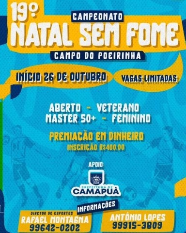 O Campeonato de Futebol Natal Sem Fome chega à sua 19ª edição com início previsto para o dia 26 de outubro. O evento, que já se consolidou como um dos principais torneios de futebol amador da região, tem como objetivo principal, além da competição, arrecadar alimentos para apoiar famílias em situação de vulnerabilidade.