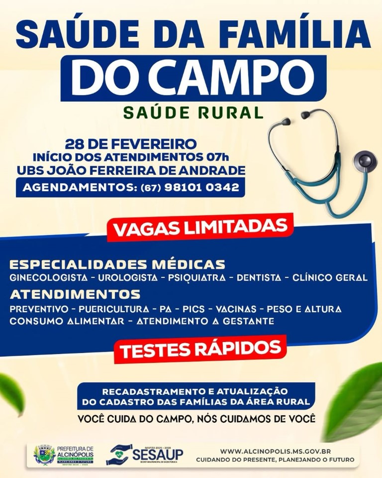 Moradores da zona rural de Alcinópolis terão acesso a uma ação especial de saúde a partir do dia 28 de fevereiro de 2026, com o início dos atendimentos do programa Saúde da Família do Campo. A atividade será realizada na UBS João Ferreira de Andrade, a partir das 7h.