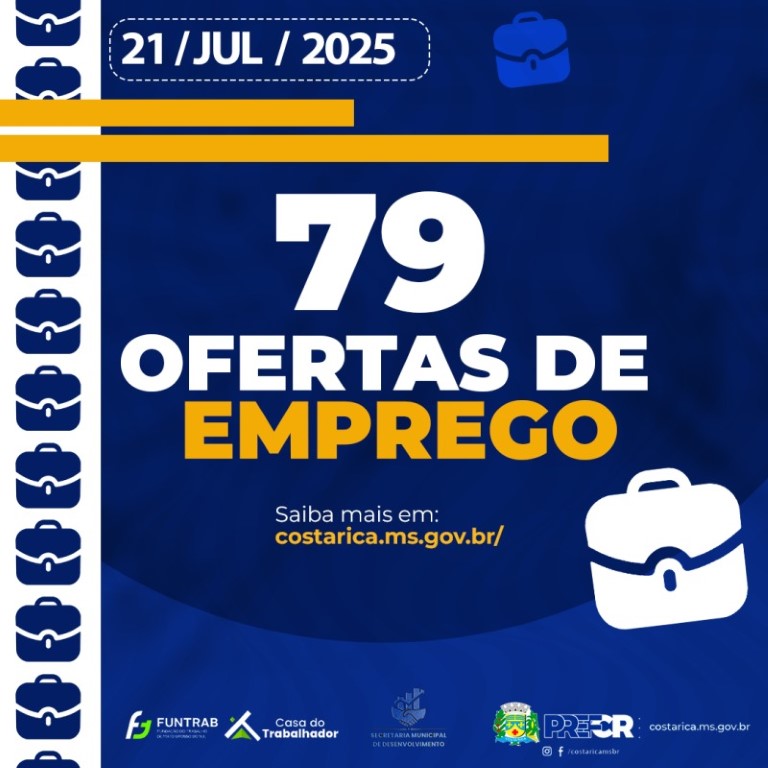 Nesta segunda-feira, 21 de julho de 2025, a Casa do Trabalhador de Costa Rica oferece 79 vagas de emprego em setores como comércio, serviços, agropecuária, indústria e construção civil, com exigência predominante de Ensino Médio completo.
