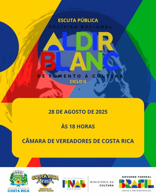 Nesta quinta-feira, 28 de agosto de 2025, às 18h, a Câmara de Vereadores de Costa Rica sediará uma Escuta Pública sobre o Ciclo II da Política Nacional Aldir Blanc. Promovida pela Secretaria de Esporte e Cultura, em cooperação com o Ministério da Cultura e o governo federal, a iniciativa busca articular propostas e ideias da comunidade local para o fortalecimento da cultura no município.