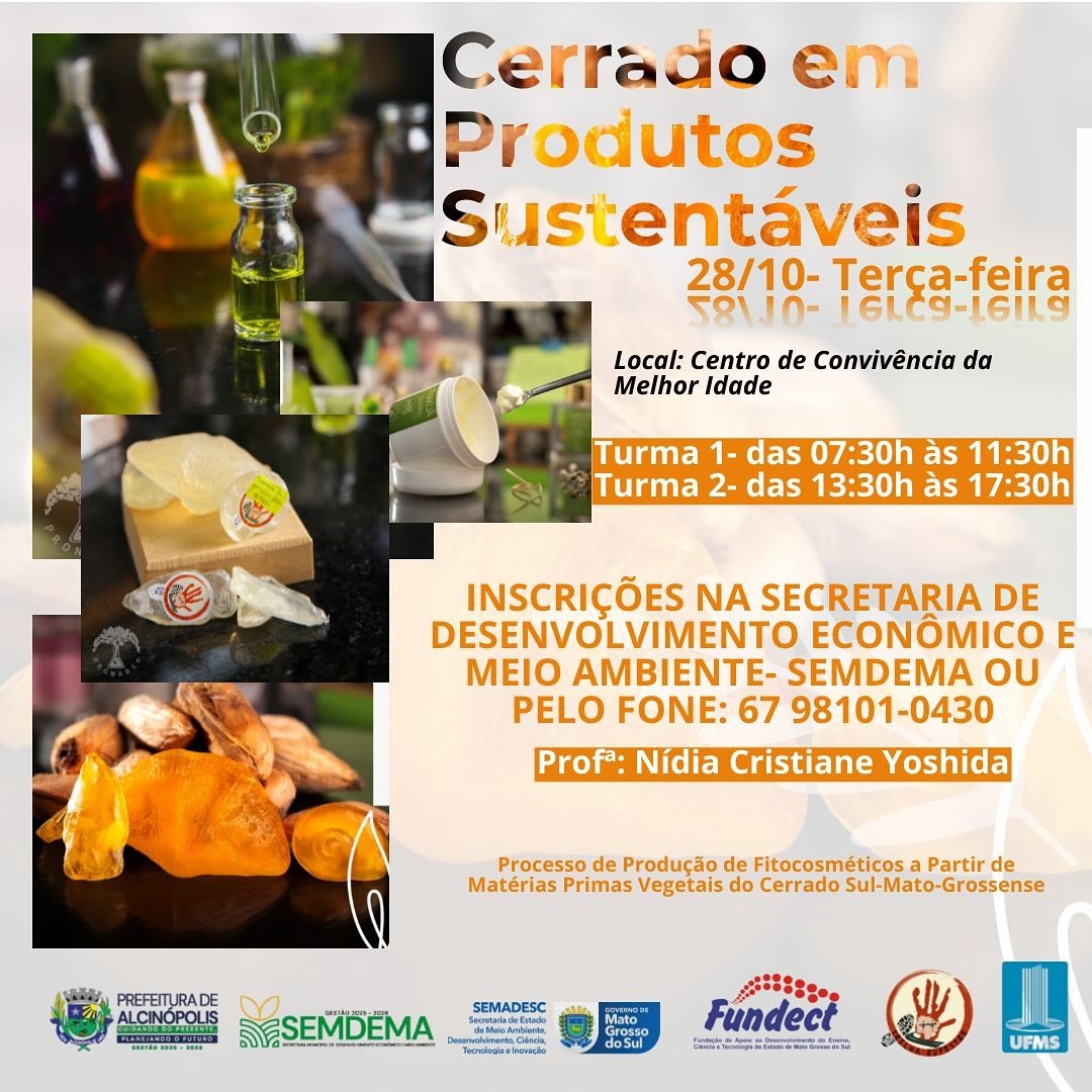 A Prefeitura de Alcinópolis, por meio da Secretaria de Desenvolvimento Econômico e Meio Ambiente (SEMDEMA), está com inscrições abertas para a oficina “Cerrado em Produtos Sustentáveis”. A formação é gratuita e ocorre na próxima terça-feira, 28 de outubro.