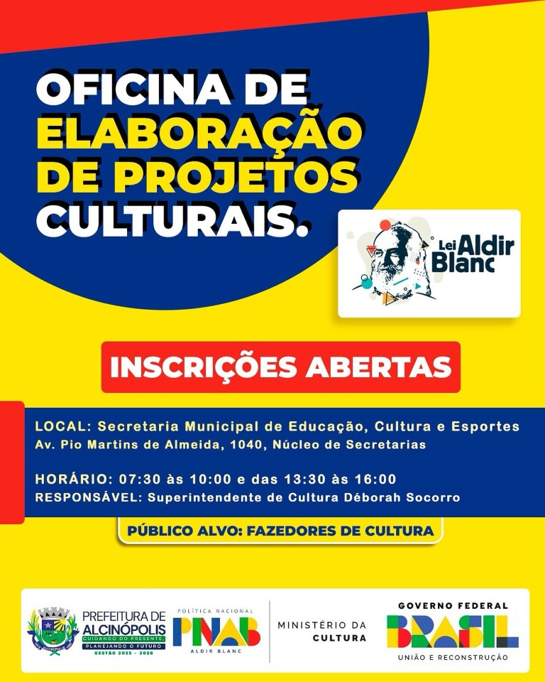Estão abertas, até o dia 12 de agosto, as inscrições para a Oficina de Elaboração de Projetos Culturais em Alcinópolis. A iniciativa, voltada a fazedores de cultura de diversas áreas, será realizada na Secretaria Municipal de Educação, Cultura e Esportes, localizada na Avenida Pio Martins de Almeida, número 1040, no Núcleo de Secretarias.