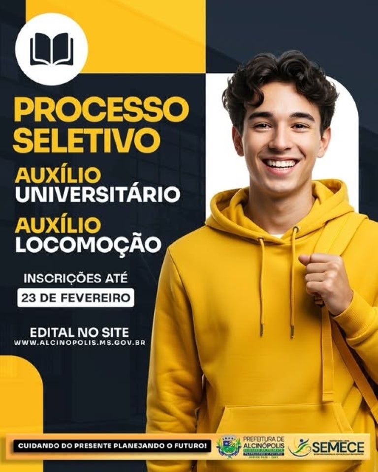 A Prefeitura de Alcinópolis abriu inscrições para o Processo Seletivo de Auxílio Universitário e Auxílio Locomoção, voltado para universitários que tenham residência no município e estejam matriculados em cursos de graduação. Os editais com regras e condições foram divulgados pela administração local e estão disponíveis no site oficial.