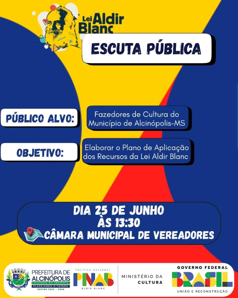 Hoje, dia 25 de junho, a Prefeitura de Alcinópolis promove a Escuta Pública para elaboração do Plano de Aplicação dos Recursos da Lei Aldir Blanc. O evento acontecerá às 13h30 no Plenário da Câmara Municipal e convida fazedores de cultura e interessados a apresentarem suas propostas e sugestões para o uso dos recursos destinados à cultura no município.