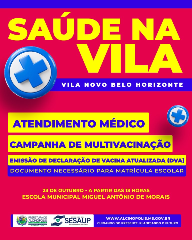 A Secretaria de Saúde de Alcinópolis promoverá nesta quinta-feira (23) uma ação na Vila Novo Belo Horizonte com serviços médicos e atualização de vacinas.
