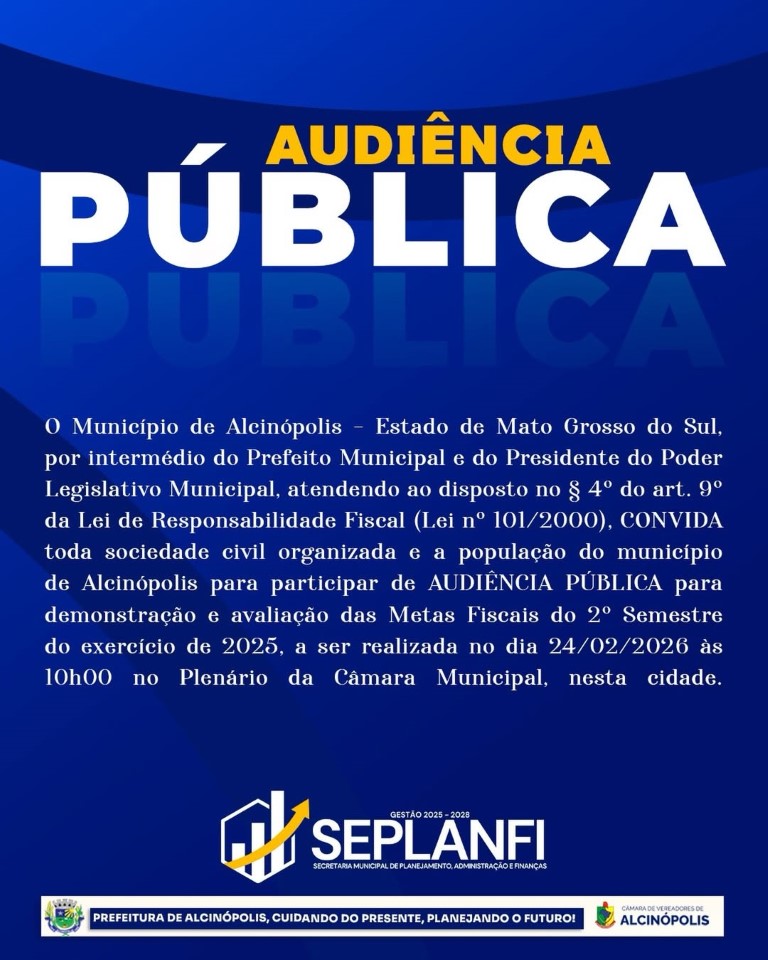 O Poder Executivo e o Poder Legislativo de Alcinópolis convocaram audiência pública para apresentação das metas fiscais relativas ao segundo semestre de 2025. O encontro ocorrerá em 24 de fevereiro de 2026, às 10h, no plenário da Câmara Municipal.
