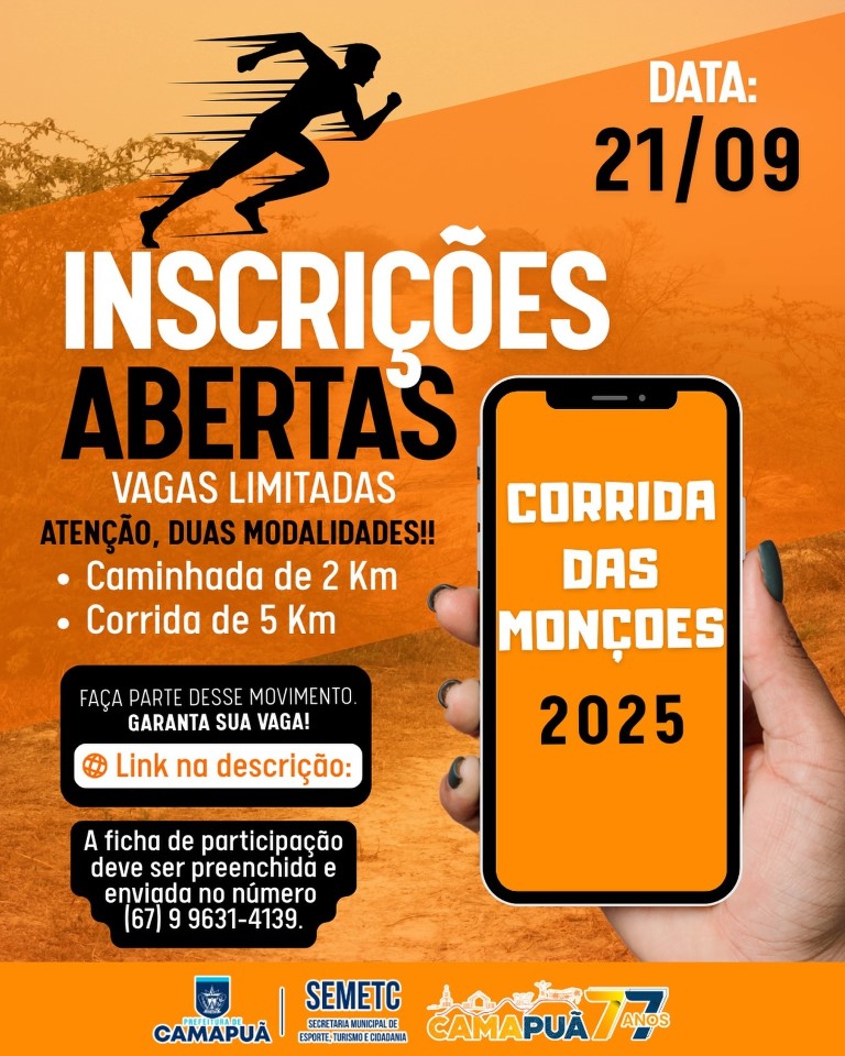 A Prefeitura de Camapuã, por meio da Secretaria Municipal de Esporte, Turismo e Cidadania, anunciou a abertura das inscrições para a Corrida das Monções 2025. O evento está programado para o dia 21 de setembro e contará com duas modalidades de participação.