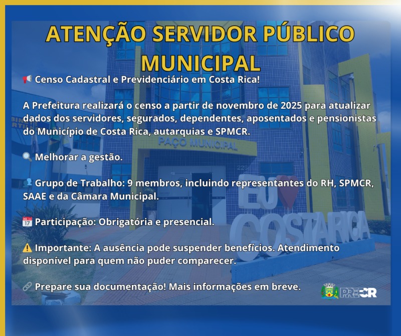 O censo será executado pelo Departamento de Pessoal em conjunto com o serviço responsável pela previdência dos servidores. O objetivo, segundo a prefeitura, é aprimorar o planejamento institucional, assegurar equilíbrio atuarial e organizar o cadastro de benefícios.