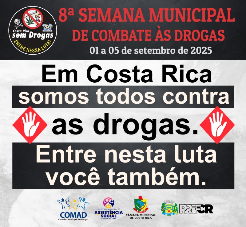 A cidade de Costa Rica organiza, entre os dias 1º e 5 de setembro, a 8ª Semana Municipal de Combate às Drogas. A iniciativa é promovida pela Prefeitura em parceria com a Secretaria de Assistência Social, Conselho Municipal Antidrogas e apoio da Câmara de Vereadores.