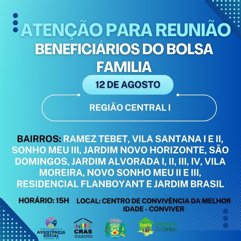 Na terça-feira, 12 de agosto de 2025, às 15h, ocorre a terceira reunião socioeducativa do Programa Bolsa Família no Centro de Convivência do Idoso (Conviver), em Costa Rica. A Prefeitura organiza a atividade com a Secretaria de Assistência Social e outras pastas.