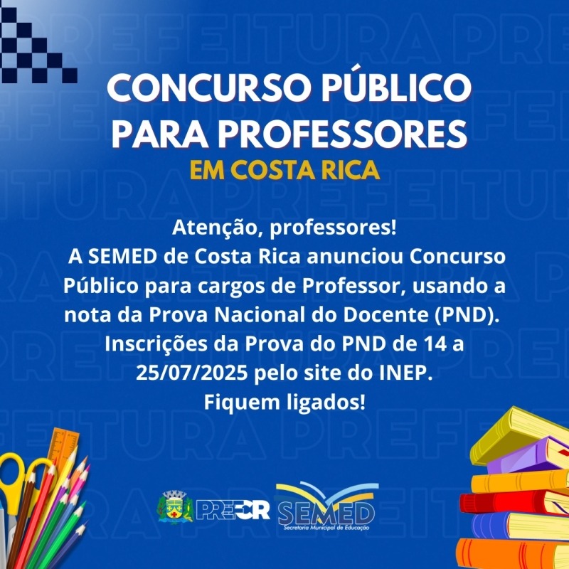 A cidade de Costa Rica utilizará a nota da Prova Nacional Docente (PND) como base para o concurso público de professores da rede municipal. O exame será realizado pelo INEP e terá provas aplicadas no dia 26 de outubro. As inscrições devem ser feitas entre os dias 14 e 25 de julho.