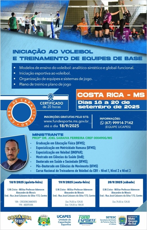 A Prefeitura de Costa Rica, por meio da Secretaria Municipal de Educação (SEMED), em parceria com o Governo do Estado de Mato Grosso do Sul, realizará o curso presencial de Iniciação ao Voleibol e Treinamento de Equipes de Base. O evento acontecerá de 18 a 20 de setembro de 2025, na Escola Cívico-Militar Professor Adenocre Alexandre de Morais, localizada no centro da cidade, com 200 vagas disponíveis.