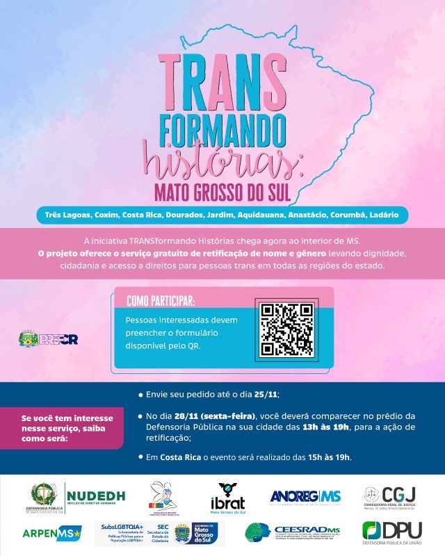 A Defensoria Pública de Mato Grosso do Sul iniciou uma nova etapa do projeto “TRANSformando Histórias”, que chega a Costa Rica com o objetivo de facilitar o acesso de pessoas trans ao processo de retificação de nome e gênero. A ação integra uma série de atividades voltadas à promoção da cidadania e à valorização da diversidade no estado.