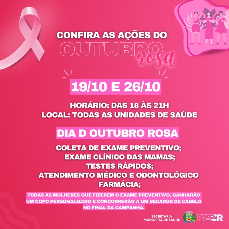 Nesta quarta-feira (19), as Unidades de Saúde de Costa Rica estarão atendendo com horário estendido, entre as 18 e 21 horas, para coleta de exames preventivos, exames clínicos de mamas, testes rápidos, além de atendimento médico, odontológico e farmácia exclusivamente para mulheres. A iniciativa é realizada pelo Governo Municipal, através da Secretaria de Saúde, e faz parte das ações da Campanha Outubro Rosa.