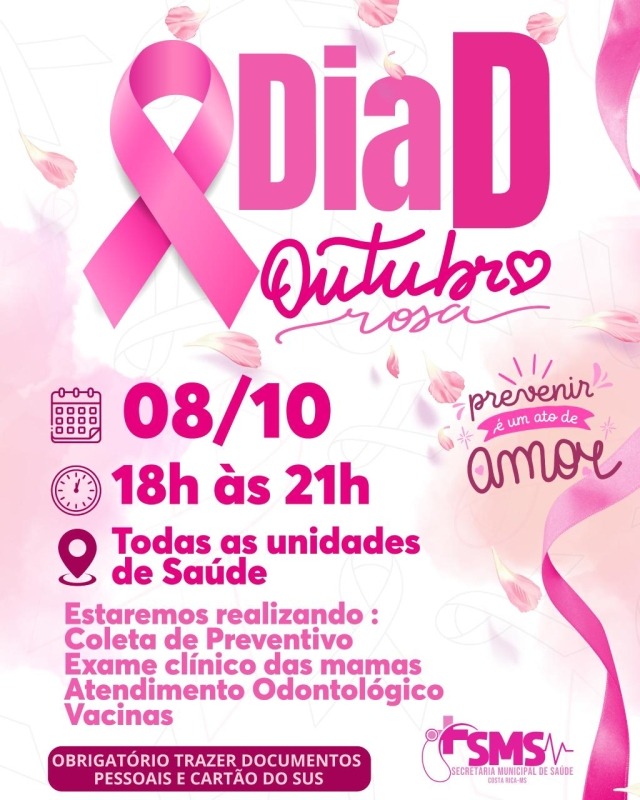 A Prefeitura de Costa Rica, por meio da Secretaria Municipal de Saúde, realizará nesta quarta-feira o Dia D da campanha Outubro Rosa. A ação é parte de um esforço para aumentar a conscientização sobre o câncer de mama e incentivar a realização de exames preventivos entre as mulheres. Durante o evento, serão oferecidos diversos serviços à população, incluindo mamografias e atendimentos médicos.