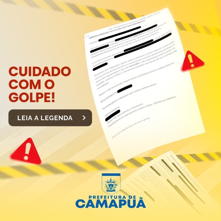 A Prefeitura de Camapuã informou nesta quarta-feira (11) que empresas do município estão recebendo e-mails falsos que solicitam a regularização de alvarás de funcionamento. Essas mensagens utilizam nomes fictícios e não correspondem aos domínios oficiais da administração municipal.