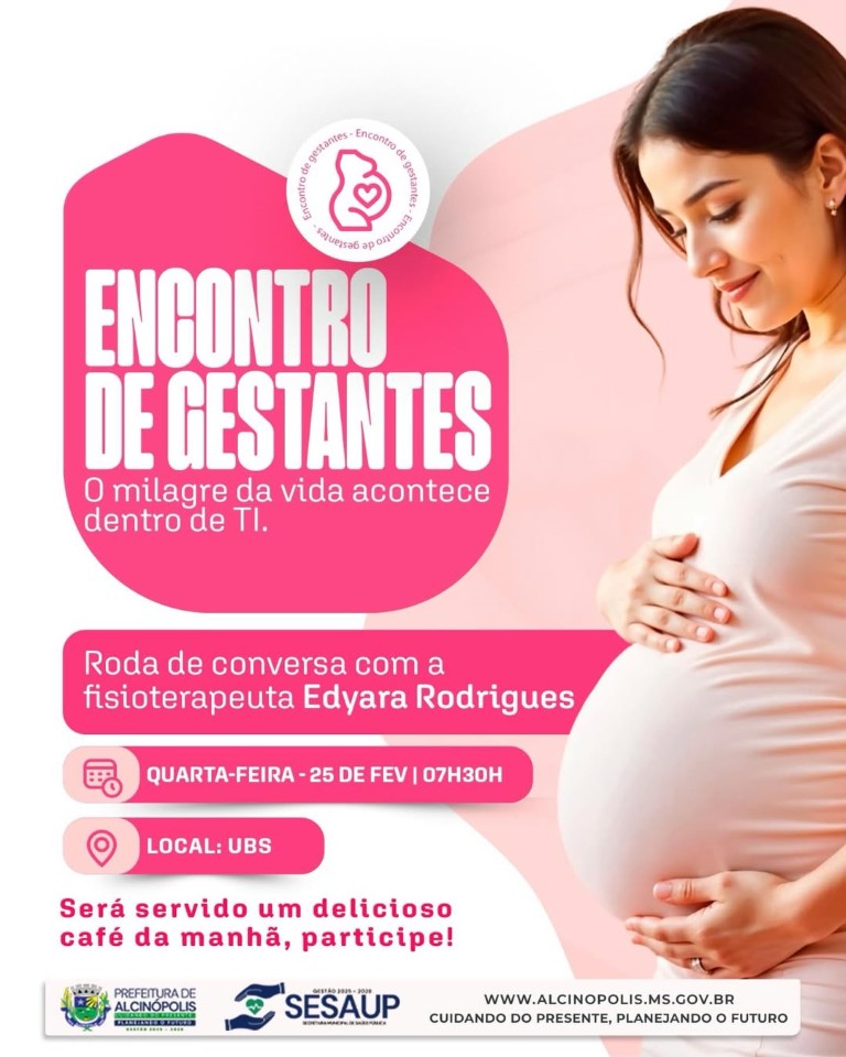 A Secretaria Municipal de Saúde Pública de Alcinópolis realiza nesta quarta-feira (25), às 7h30, o Encontro de Gestantes na Unidade Básica de Saúde.