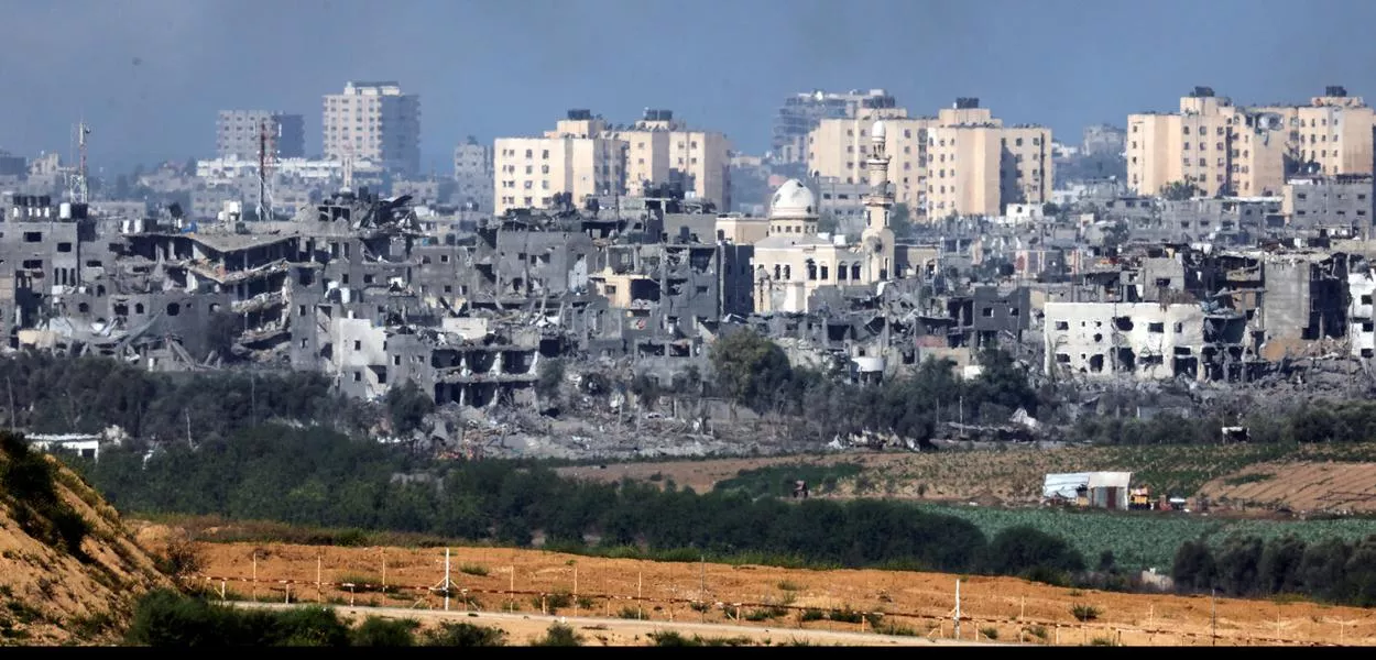 Uma vista mostra prédios destruídos na Faixa de Gaza, vistos a partir da fronteira de Israel com a Faixa de Gaza, no sul de Israel (Foto: REUTERS/Amir Cohen)