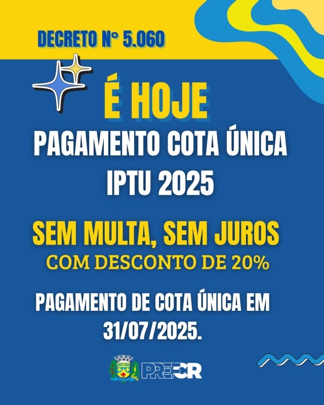 Hoje, 31 de julho de 2025, expira o prazo para o pagamento à vista do IPTU com 20% de desconto em Costa Rica. A condição está prevista no Decreto nº 5.060, publicado em julho, e aplica-se para pagamento em cota única até a data limite.
