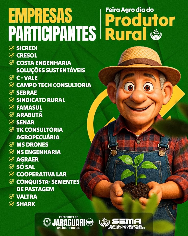 A Prefeitura de Jaraguari, em parceria com a Secretaria Municipal de Meio Ambiente e Agricultura, realiza no dia 1º de agosto a Feira Agro Dia do Produtor Rural, no Sítio Pingo D’Ouro. Com início às 7h30, o evento reunirá produtores, especialistas, sindicatos, cooperativas e empresas do setor agropecuário em uma programação voltada ao fortalecimento da agricultura familiar e da pecuária local.