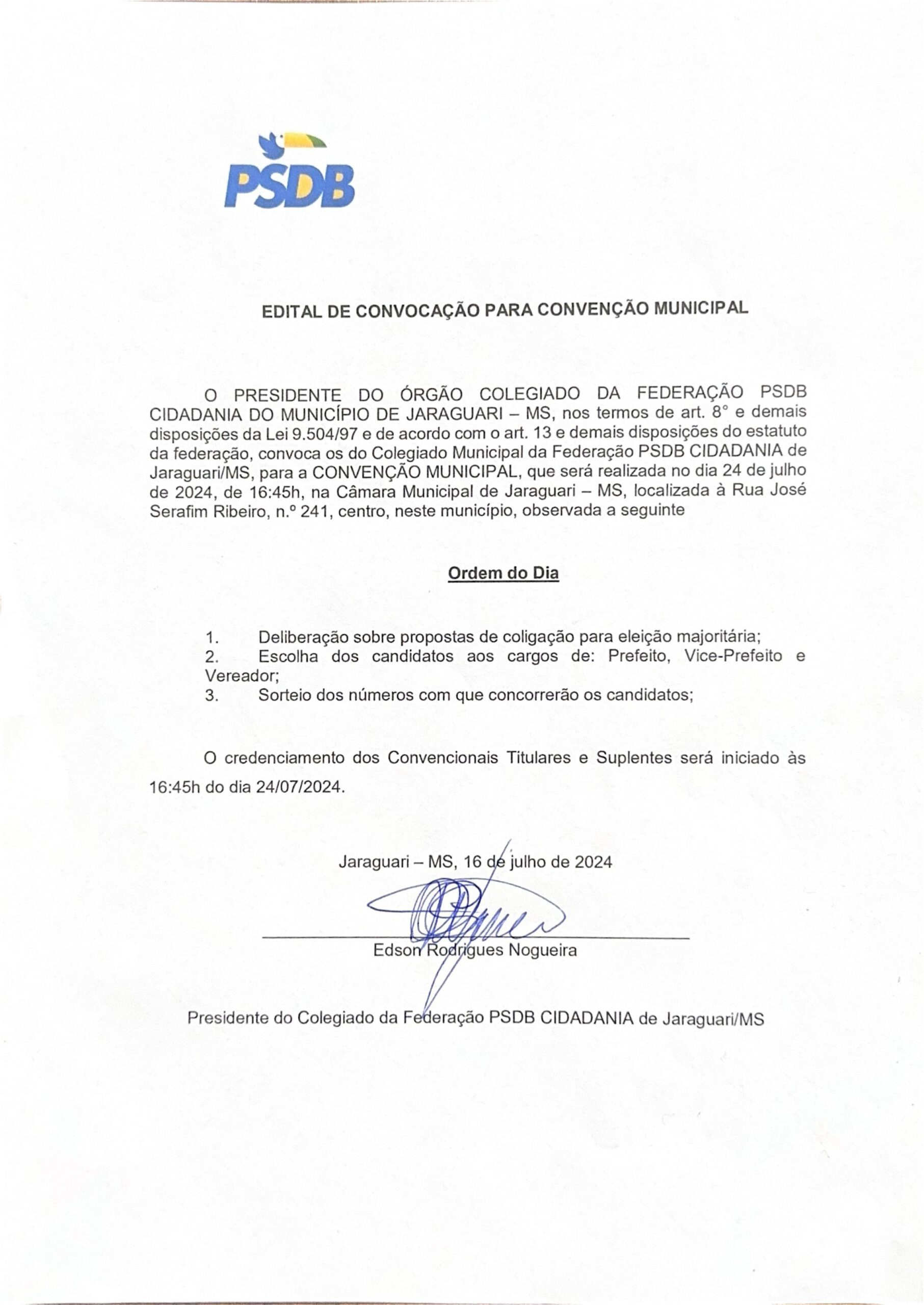 Jaraguari: PSDB divulga Edital de Convocação para Convenção Municipal