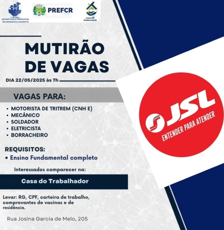 A Casa do Trabalhador de Costa Rica promove nesta quinta-feira (22), a partir das 7h, um mutirão de vagas para 150 profissionais na empresa JSL, com atuação em Ribas do Rio Pardo. O processo seletivo ocorrerá nas instalações da Casa do Trabalhador, localizada na Rua Josina Garcia de Melo, 205.