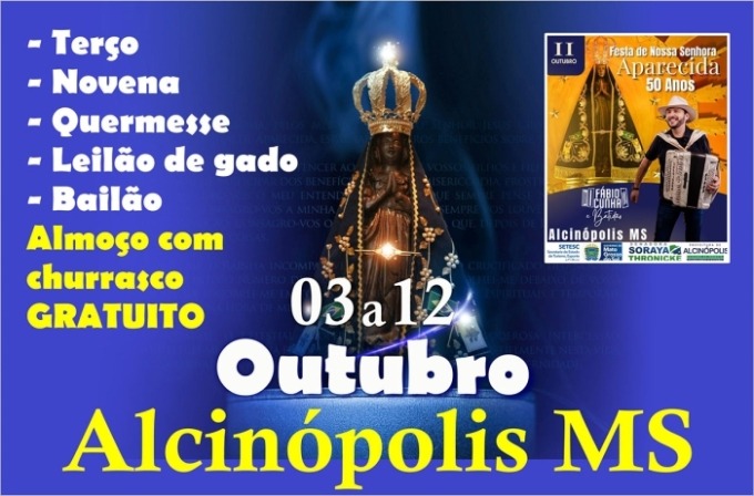 Alcinópolis realizará entre os dias 3 e 12 de outubro, uma programação em homenagem ao jubileu de prata — 50 anos de devoção — à padroeira Nossa Senhora Aparecida. As celebrações terão início com terço às 18h30 e novena às 19h nos primeiros nove dias.