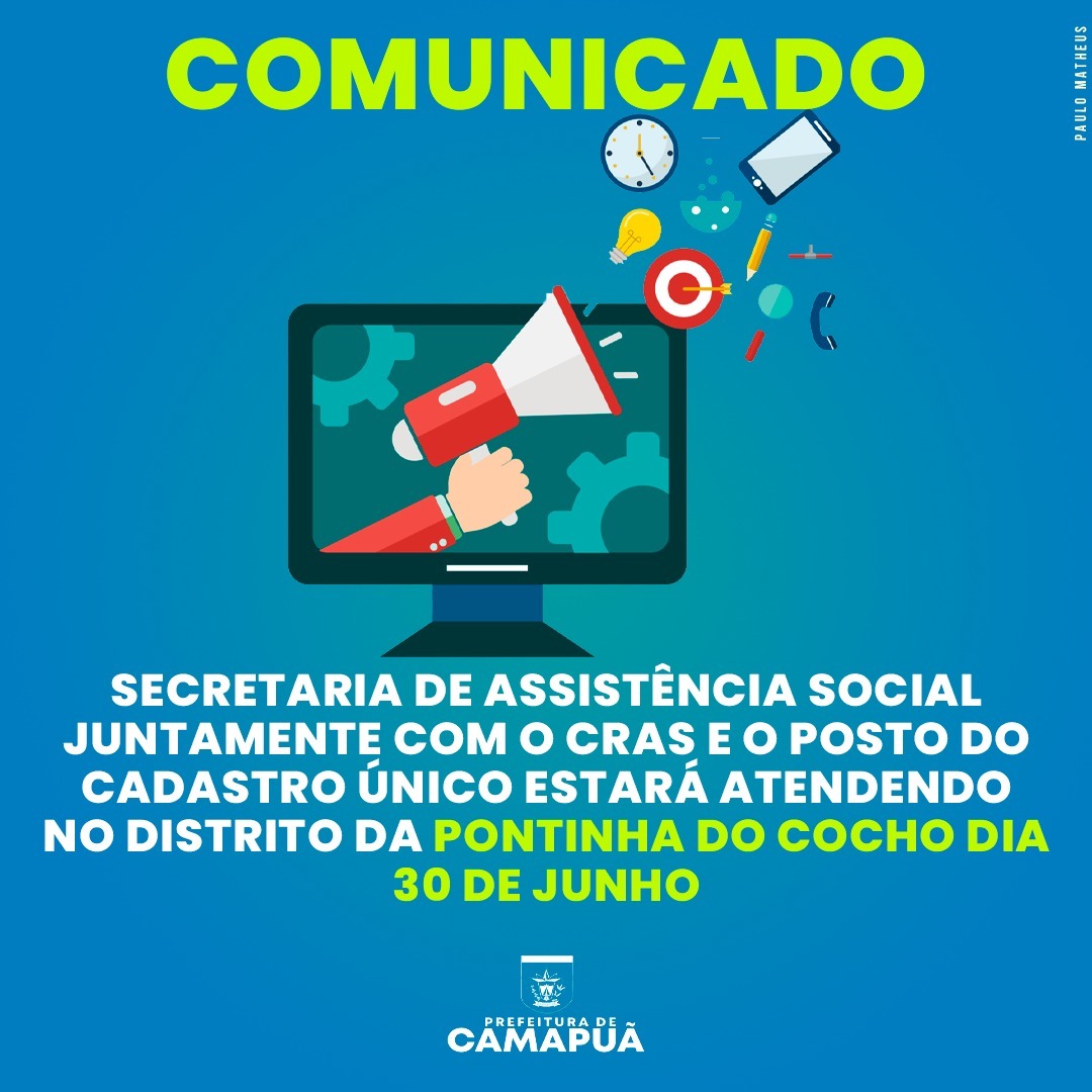 No dia 30 de junho a equipe da Secretaria de Assistência Social estará no distrito da Pontinha do Cocho realizando atendimentos para os moradores.