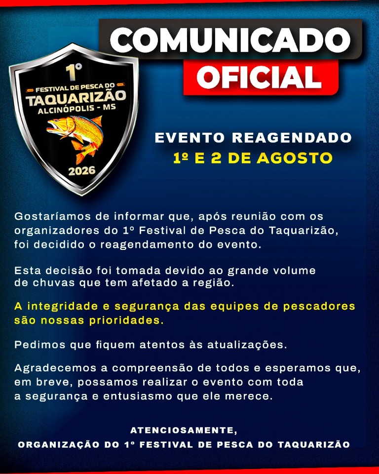 A nota oficial é assinada pela organização do 1º Festival de Pesca do Taquarizão, que informou esperar realizar o evento dentro das condições adequadas previstas para a nova data.