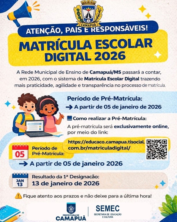 A Secretaria Municipal de Educação e Cultura de Camapuã anunciou a adoção do sistema de matrícula escolar digital para o ano letivo de 2026 na rede municipal de ensino. A iniciativa altera o formato tradicional de cadastro dos estudantes.
