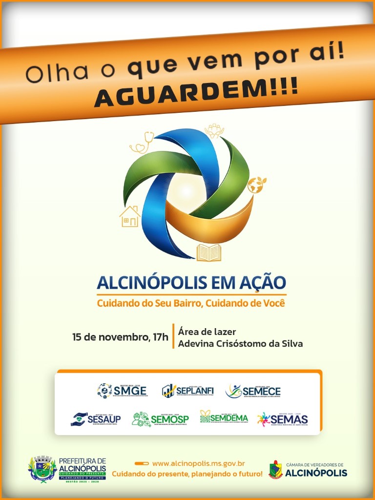 A prefeitura de Alcinópolis, em conjunto com a Câmara de Vereadores, anunciou o lançamento do programa denominado “Alcinópolis em Ação – Cuidando do Seu Bairro, Cuidando de Você”. A iniciativa ocorre no dia 15 de novembro às 17h, na área de lazer Adevina Crisóstomo da Silva.