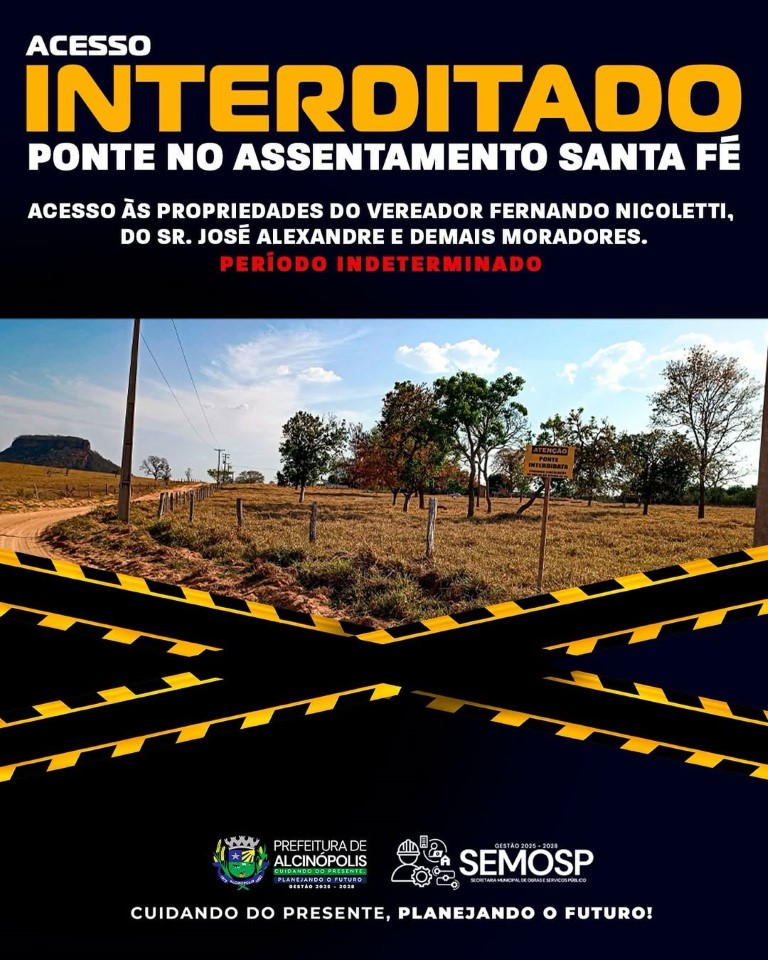 A Prefeitura de Alcinópolis anunciou a interdição do acesso sobre a ponte no assentamento Santa Fé, que dá passagem às propriedades do Vereador Fernando Nicoletti, do Sr. José Alexandre e de outros moradores da localidade. A medida temporária visa garantir a realização de obras de recuperação e melhorias nas vias da região.