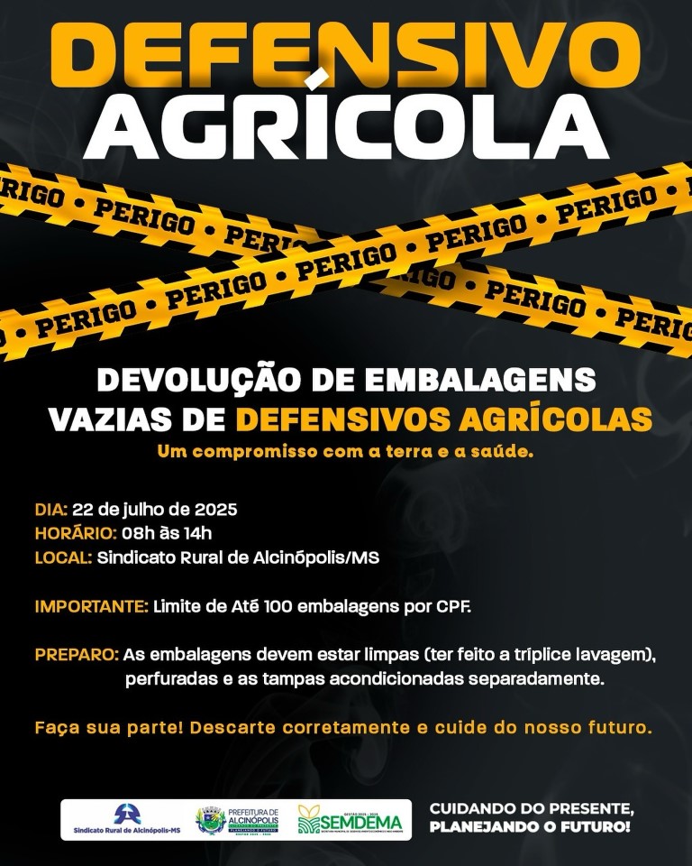 A Prefeitura Municipal de Alcinópolis, em uma ação coordenada com órgãos locais, está incentivando a devolução correta das embalagens vazias de defensivos agrícolas. A campanha tem como objetivo conscientizar a população sobre a importância do descarte adequado desses produtos para a preservação do meio ambiente e a proteção da saúde pública.