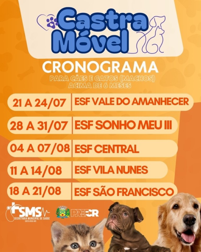 A Prefeitura de Costa Rica, por meio da Vigilância em Saúde, divulgou o calendário do Castramóvel para os próximos dois meses. O serviço atenderá cães e gatos machos com idade acima de seis meses em diferentes bairros da cidade.
