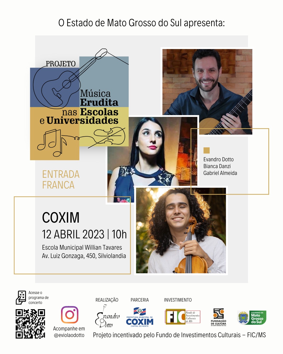 Projeto “Música Erudita nas Escolas e Universidades” foi contemplado pelo FIC (Fundo de Investimentos Culturais), promovido pela FCMS (Fundação de Cultura de Mato Grosso do Sul), por meio da Setescc (Secretaria de Estado de Turismo, Esporte, Cultura e Cidadania), do Governo do Estado de Mato Grosso do Sul. Trabalho artístico que conta com o apoio da UFMS.