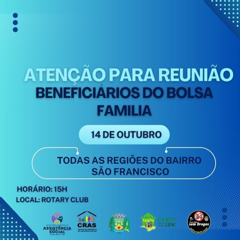 Costa Rica recebe nesta terça-feira (14), no Rotary Club, a reunião socioeducativa do Bolsa Família, evento essencial para as famílias cadastradas no programa. A reunião acontecerá às 15h e tem o objetivo de reforçar as obrigações e diretrizes do programa federal, como acompanhamento de saúde e frequência escolar para os beneficiários.