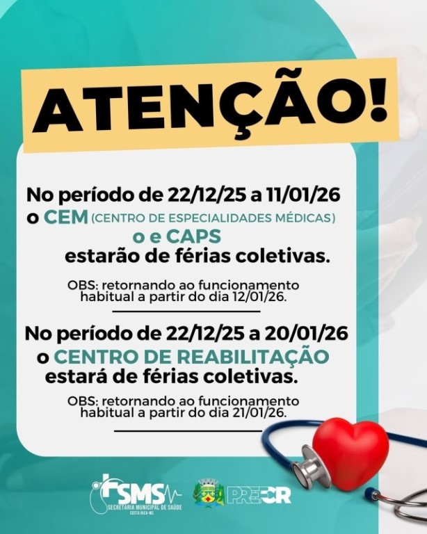 A Prefeitura de Costa Rica, por meio da Secretaria Municipal de Saúde, informou que as unidades de saúde do município estarão em férias coletivas de 22 de dezembro de 2025 a 20 de janeiro de 2026. A medida impactará o atendimento à população neste período de fim de ano.