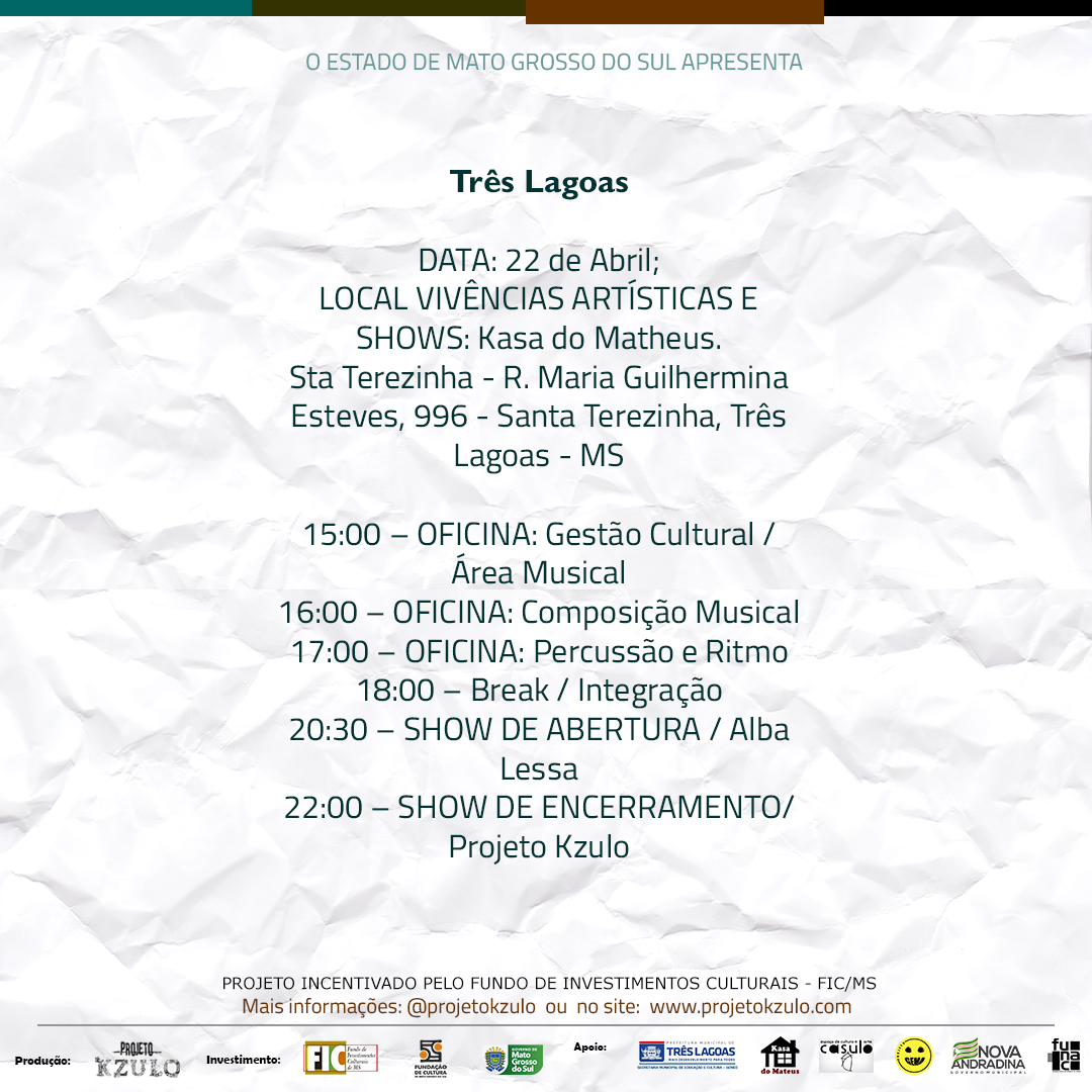 A cidade de Três Lagoas é a segunda a receber o show “Memória e Identidade” do projeto Kzulo, que está circulando por algumas cidades de Mato Grosso do Sul. O grupo já passou por Dourados e ainda fará o show em Nova Andradina, no dia 6 de maio. Na cidade que faz fronteira com o Estado de São Paulo, o show acontece na Kasa do Mateus, neste sábado (22), a partir das 20h30, e tem entrada gratuita.