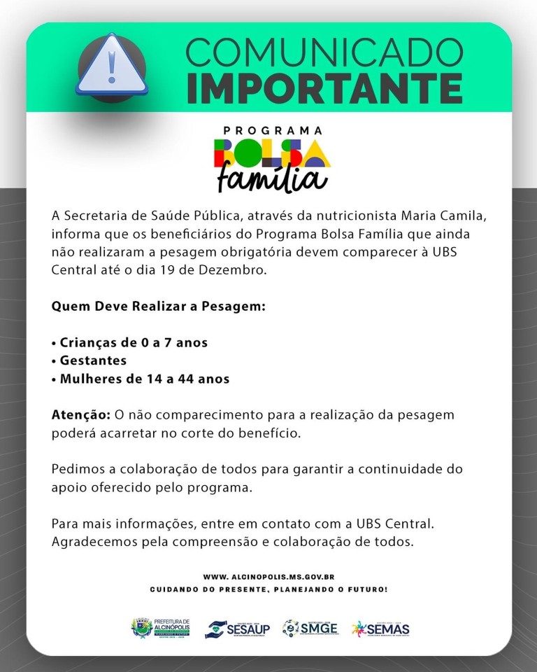 A Secretaria de Saúde de Alcinópolis informou que a pesagem de beneficiários do Bolsa Família segue até 19 de dezembro na UBS Central. A atividade, coordenada pela nutricionista Maria Camila, faz parte das condicionalidades de saúde exigidas pelo programa federal.
