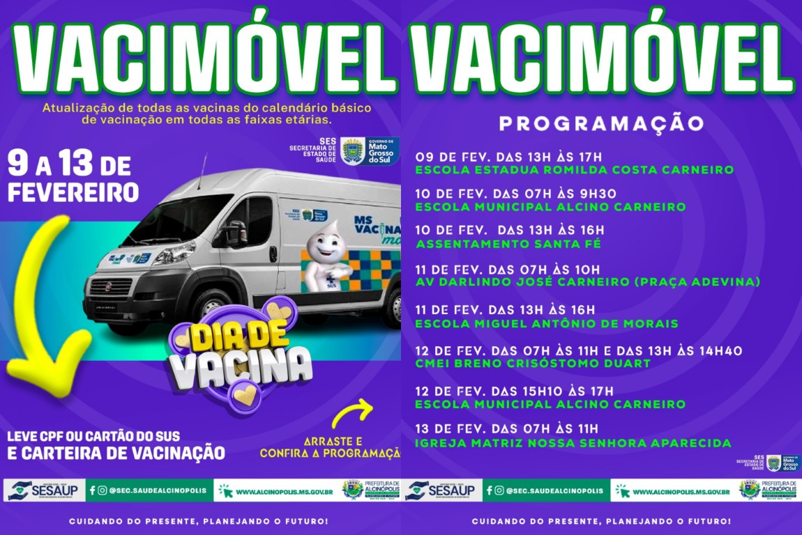 A Prefeitura de Alcinópolis definiu o cronograma de atendimento do Vacimóvel, que percorre a cidade entre os dias 9 e 13 de fevereiro com ações de vacinação itinerante. A iniciativa visa atualizar o calendário vacinal da população em todas as faixas etárias.